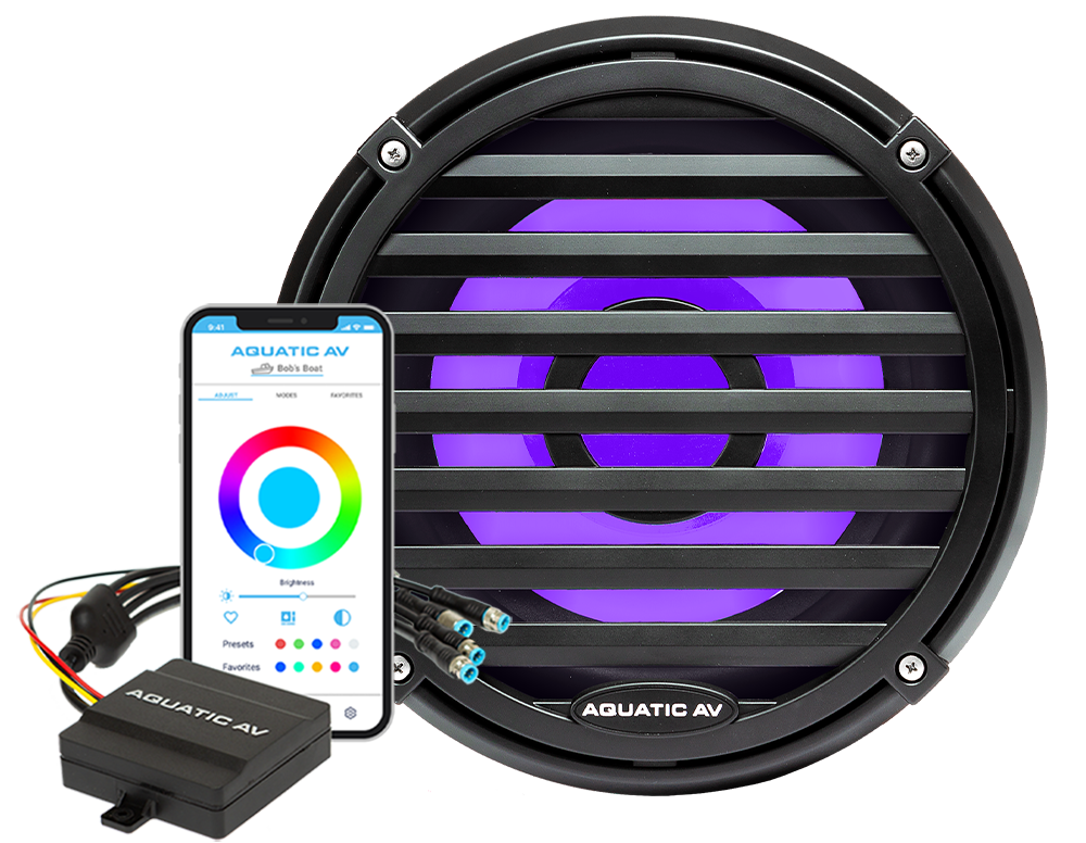 Superior waterproof protection ensure durability in any environment, and LED cone illumination represents more than a simple audio upgrade; customizable lighting at the touch of a screen when paired with the free Aquatic AV app and RGB Controller (RG100) offers a serious style enhancement to match the power of your aesthetic to the power of your audio.